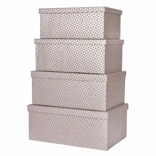 Dale un toque sofisticado a cualquier estancia con este exclusivo Set de 4 cajas en tonos marrón y dorado, con un elegante patrón de rombos estilo arlequín. Perfectas para decorar y organizar sin renunciar al diseño.