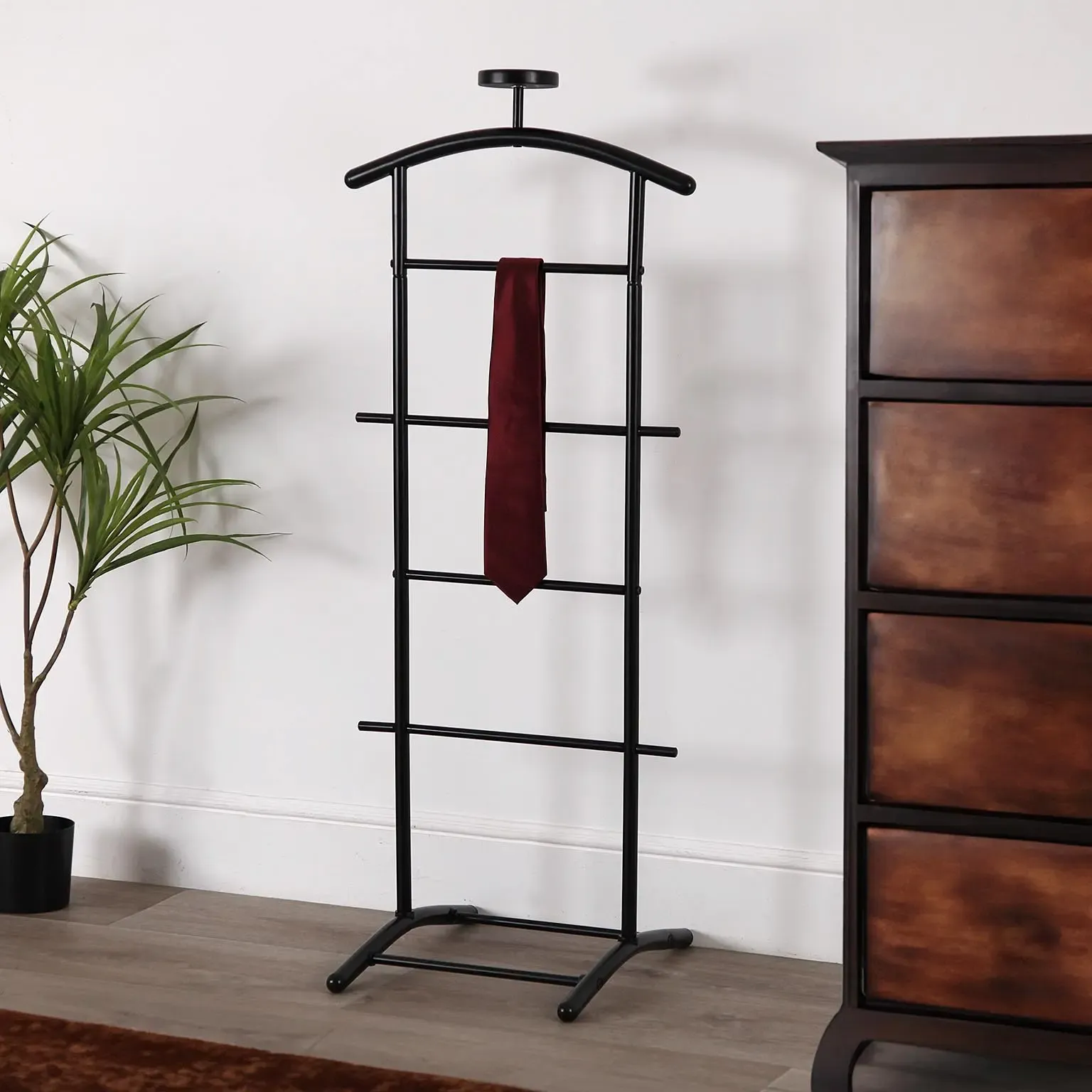 Un toque de estilo y funcionalidad para tu dormitorio. Este galán en elegante acabado negro es perfecto para organizar tus prendas nocturnas o planificar el look del día siguiente. Su diseño sofisticado y versátil se adapta a cualquier decoración moderna o clásica. Mantén tu espacio ordenado con este galán que combina estética y practicidad a la perfección.