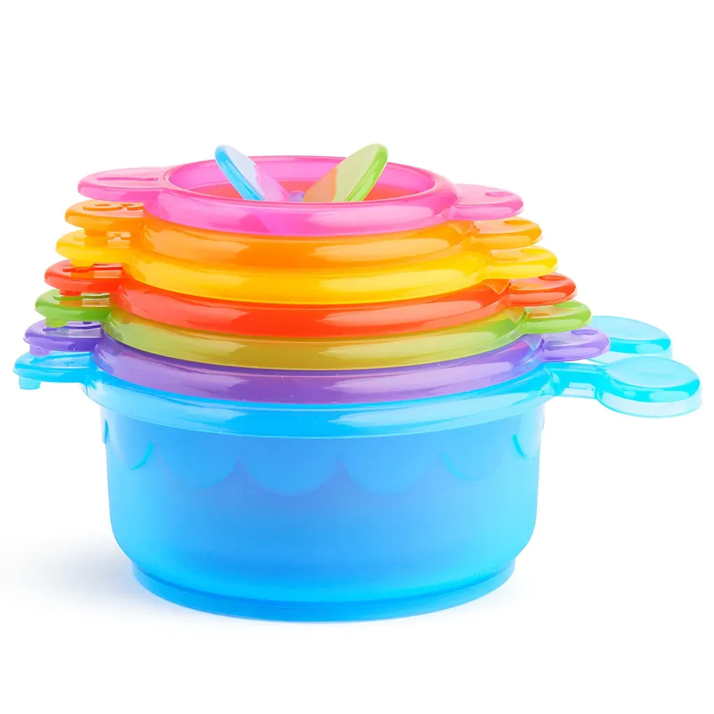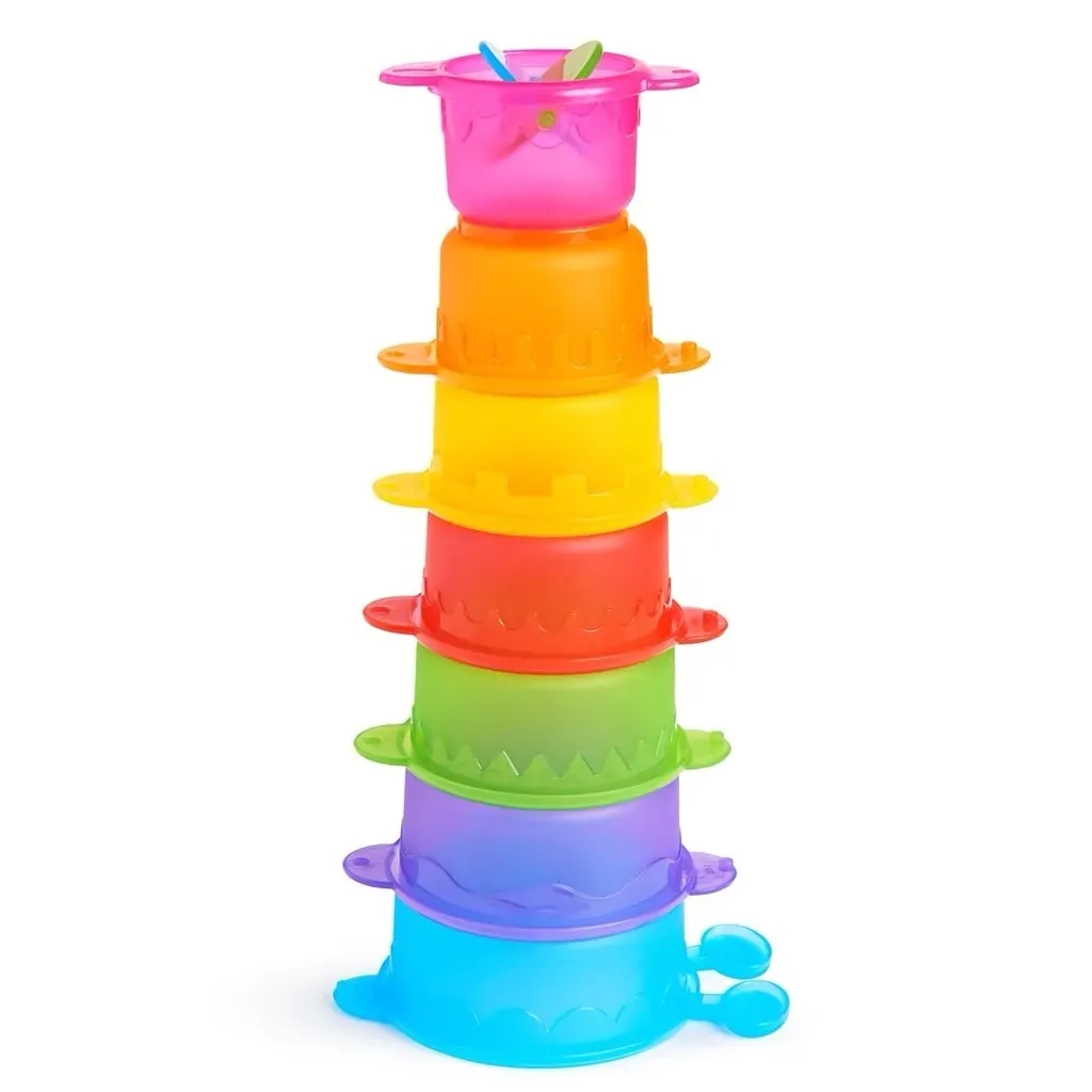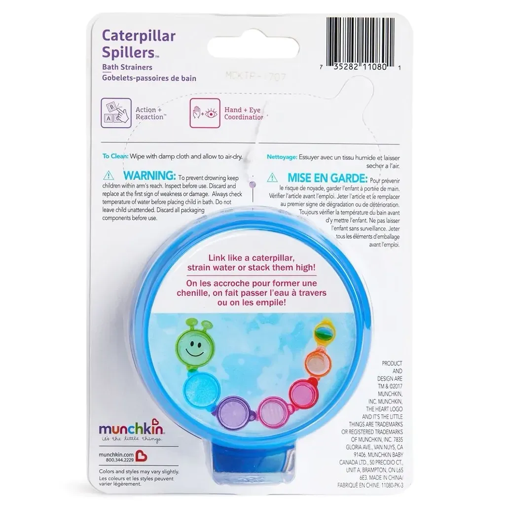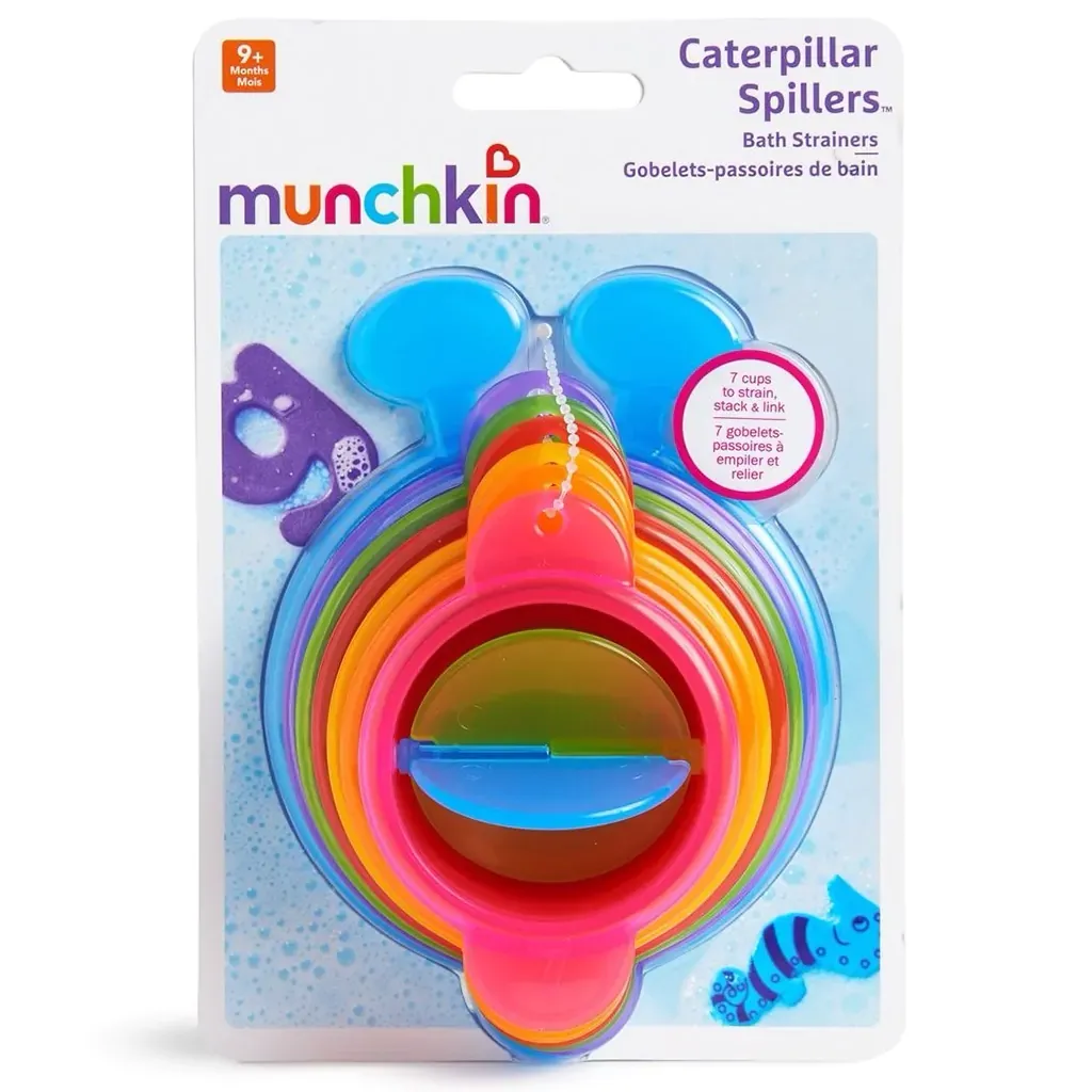 A los niños les encanta verter agua en la bañera (y no solo en ella). La oruga de cuencos apilables Caterpillar Spillers™ mantendrá su mente ocupada mientras los apilan, recogen agua, la derraman, la vierten, se enjuagan y vuelven a empezar. A tu peque le encantará conectar los cuencos numerados para crear una simpática oruga, o apilarlos para formar una torre altísima. Los números le ayudan a aprender a contar, mientras que encajando los vasos por tamaño unos dentro de otros fomentan la coordinación mano-vista y les enseña las diferencias de tamaño.