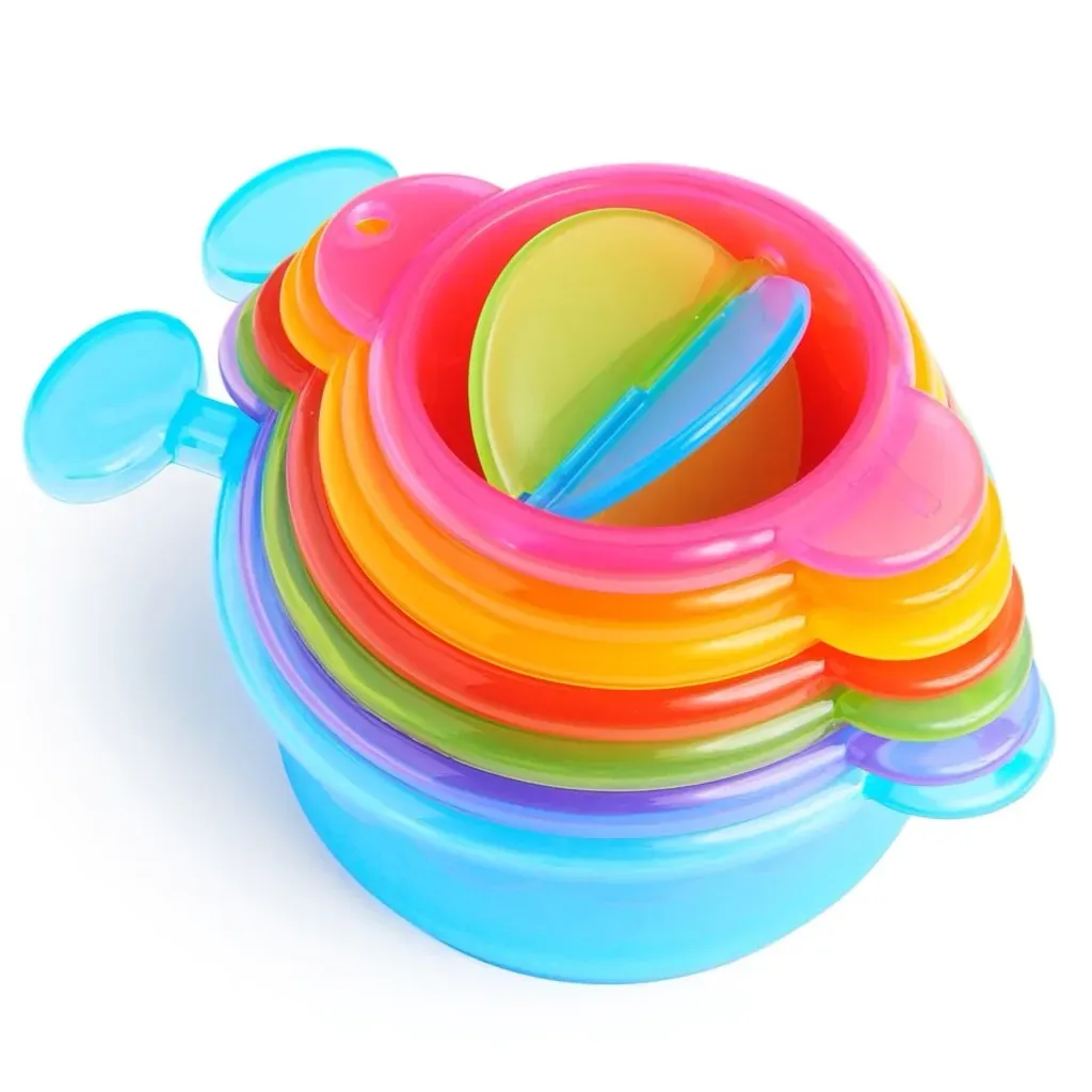 – 7 coloridos cuencos/coladores que se conectan en fila, se apilan, cuelan y vierten agua.