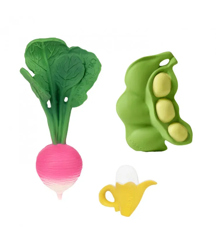 El regalo más original para recién nacidos. Llenos de diseños y texturas, estos mordedores para bebés aliviarán las encías de los más pequeños mientras desarrollan su sentido del tacto. Introduce a los más pequeños en hábitos saludables mientras muerden frutas y verduras. Regala juguetes sostenibles y seguros.